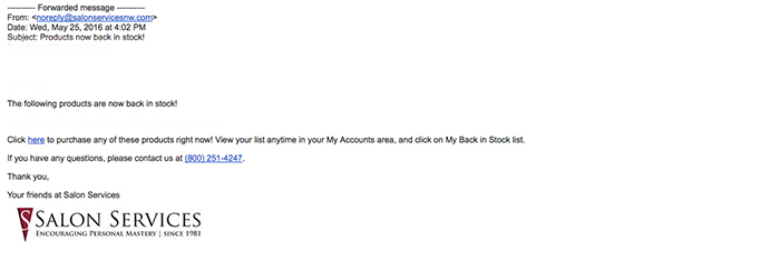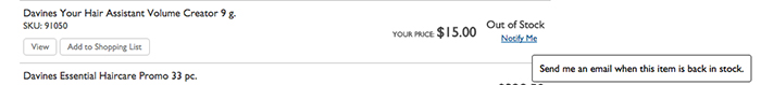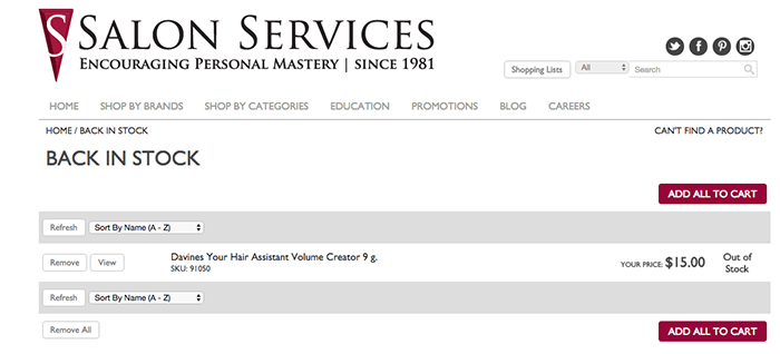 Keep track of your items that are Out of Stock with our Back in Stock features at Salon Services. You will be notified that your item is Back in Stock in two ways: