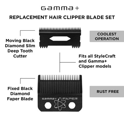 Gamma+ Replacement Fixed Black Diamond Carbon DLC Faper Clipper Blade, combined with a moving Black Diamond Carbon blade, offers precision and durability for smooth, snag-free cuts. Designed for professional use, these blades ensure long-lasting performance and sharpness.
